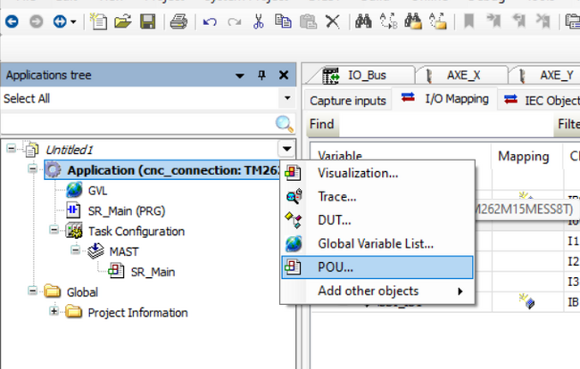 1. Faire un clic droit sur l’application. 2. Sélectionner Add Object. 3. Créer un nouveau POU.