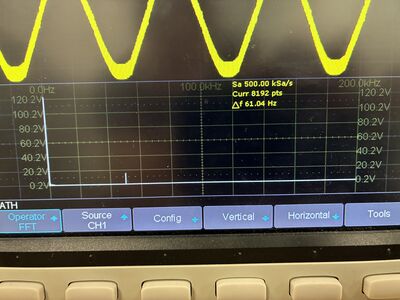 Graphique FFT avec des ondes harmoniques 50k Hz sur le sinus 60 Hz. Dans celui-ci, nous pouvons voir la grande ligne blanche la plus à gauche qui montre la présence du signal 60 Hz dans ce que l'oscilloscope voit. Puis, la ligne plus petite vers la droite montre la présence des ondes supra harmoniques à 50k Hz.