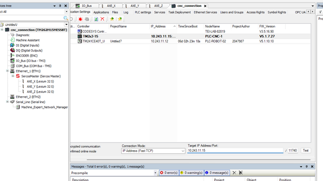 1. Localiser le champ Connection Mode (en bas de la fenêtre). 2. Entrer l’adresse IP du PLC visé. 3. Cliquer sur Test pour valider la communication.